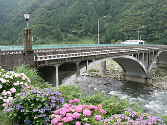 住所:鳥取県八頭郡若桜町 長さ:83.3m 橋の幅:5.5m 説明:若桜橋は、昭和8年に着工し、翌昭和9年に完成しました。若桜橋にはアーチが3つある美しい橋でした。また3連のアーチ橋は昭和20年まで県内にはありませんでした。またその希少さから平成16年に土木学会選奨土木遺産に指定され、橋のたもとには、土木遺産認定を記念して、平成19年に石碑が設置されました。